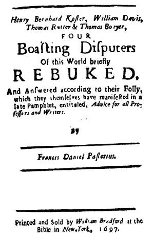 Evidently Koster, Thomas Rutter*, William Davis, and Thomas Bowyer teamed up and published a pamphlet of their radical views (in High German and in English) entitled “Advice for All Professors and Writers.” No copies have been found, but in 1697 Francis Daniel Pastorius, founder of Germantown, published a refutation of this pamphlet entitled “Henry Bernhard Koster, William Davis, Thomas Rutter & Thomas Bowyer, four boasting disputers of this world briefly rebuked, and answered according to their folly, which they themselves have manifested in a late pamphlet, entitled, Advise for all professors and writers.” This pamphlet does exist and it gives insight into the contents of the former publication and the activities of the four named men. It hints at a communal experiment called “Irenia” near Germantown.