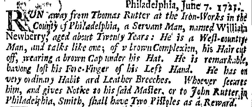 *Thomas Rutter, who arrived in the colony as a Quaker, established Pennsylvania’s first iron forge, on the Manatawny Creek, in 1716, and later joined the Seventh Day Baptist Church.
